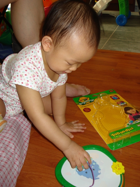 小-自己吃飯可以準確的把湯匙放進碗裡面舀飯(會灑飯到碗外),然後準確的放入口中(中途都不會灑出來);對於不小心掉在餵食椅盤子上面的食物,可以全部一個不剩的用手拿起來吃,手上的飯粒當然也不會放過;能順利準確對準自己把buckle扣上,但無法解開(因為需要手指很用力的壓住兩邊);喜歡玩按扣,但目前還沒有成功;對於釦子很有興趣,會要你教他扣上,但是釦子放到洞裡了無法抓到時間從另一邊拉出來;開始喜歡穿洞遊戲,不過最愛拿著繩子走來走去,對於繩子要穿到洞裡面的事情不太關心。